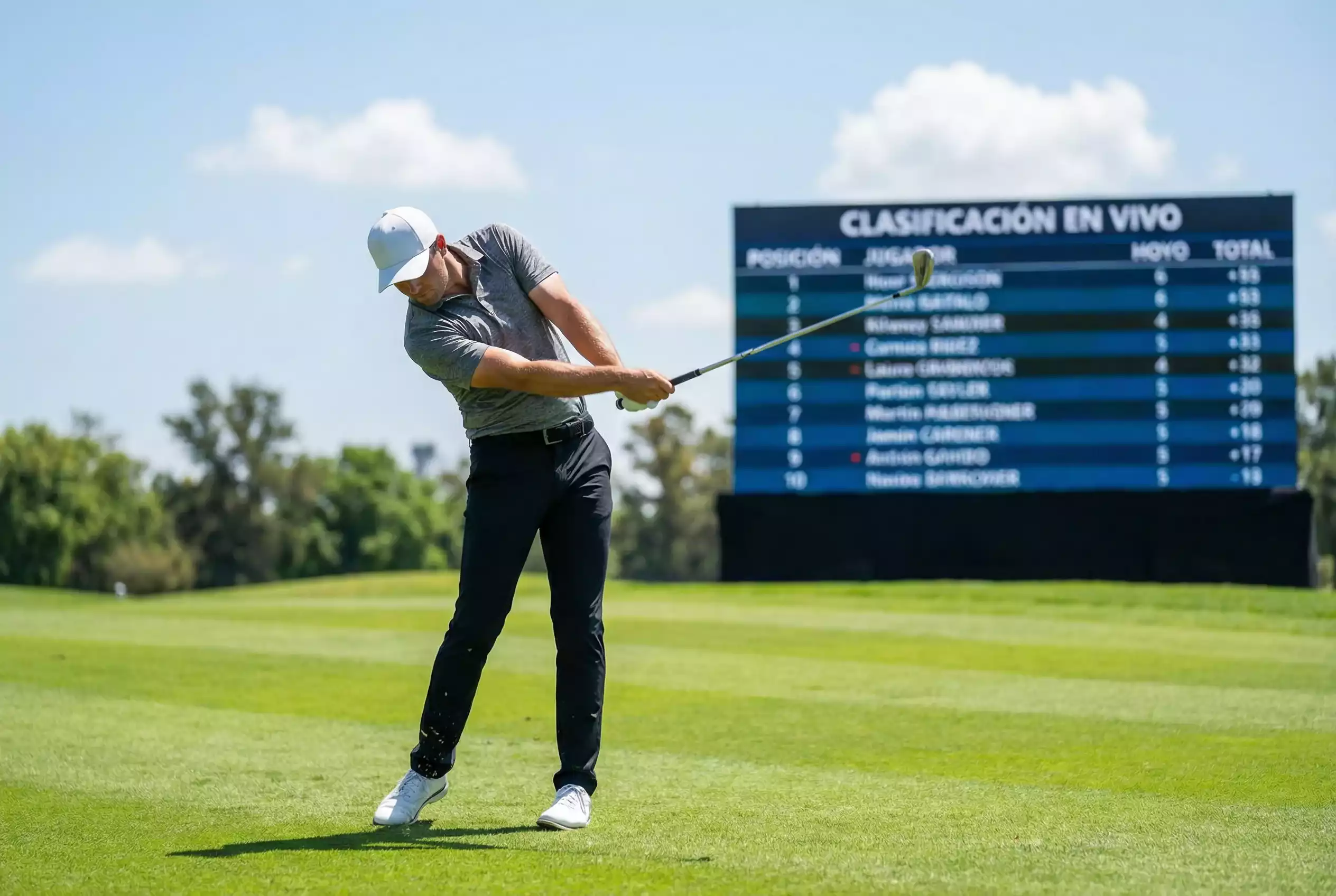 Lo imprescindible: el leaderboard en tiempo real del PGA Tour o del DP World Tour, que se actualiza hoyo a hoyo con las posiciones y los scores parciales de todos los jugadores. Es gratuito y es tu fuente principal de datos. A partir de ahí, las estadísticas en vivo de strokes gained — disponibles en varias plataformas de datos golfísticos — te dan la capa analítica que el leaderboard no muestra.
